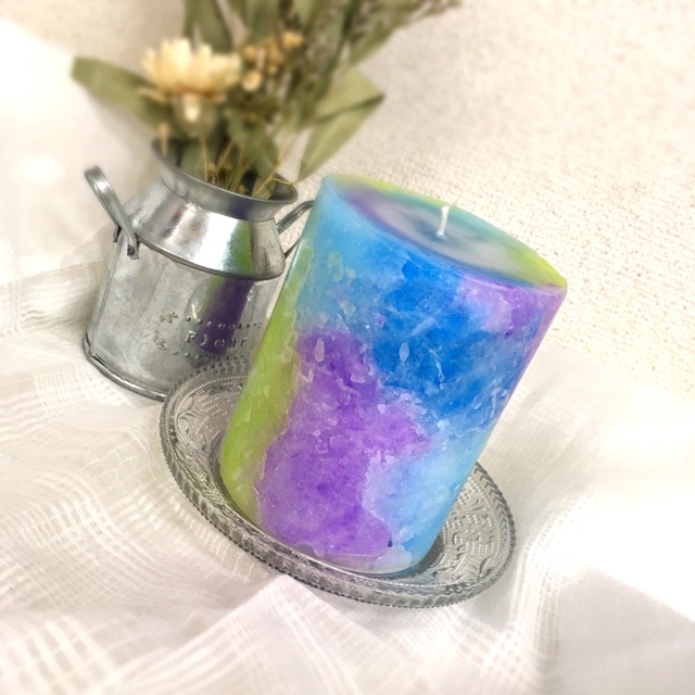 インテリアにもギフトにも最適なホイップキャンドルです。 黄緑、水色、ブルーパープルの原色のホイップキャンドルとなっております。 ちょっと派手目に攻めてみました。 ホイップとは、蝋をホイップ状にしてから埋め込んで模様のようにして作っていくキャンドルとなります。 キャンドルは一つ一つ手作りとなっておりますので、写真とは若干異なる場合がございます。 ご了承下さい。 ☆ラッピングは無料で承ります。(4枚目写真参照) 無香料となっております。 *火を灯す時は受け皿を使用し、目を離さないよう安全な環境でお楽しみ下さい。 サイズ☆W7.5㎝×H9㎝ 原料☆パラフィンワックス・顔料