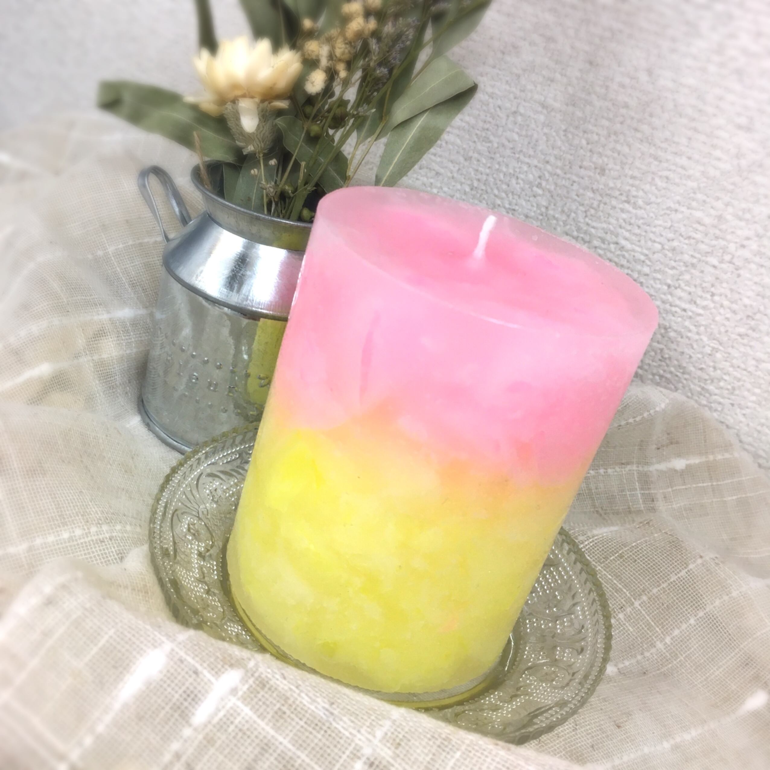 ネオンピンクとネオンイエローのチャンクキャンドルとなっております。