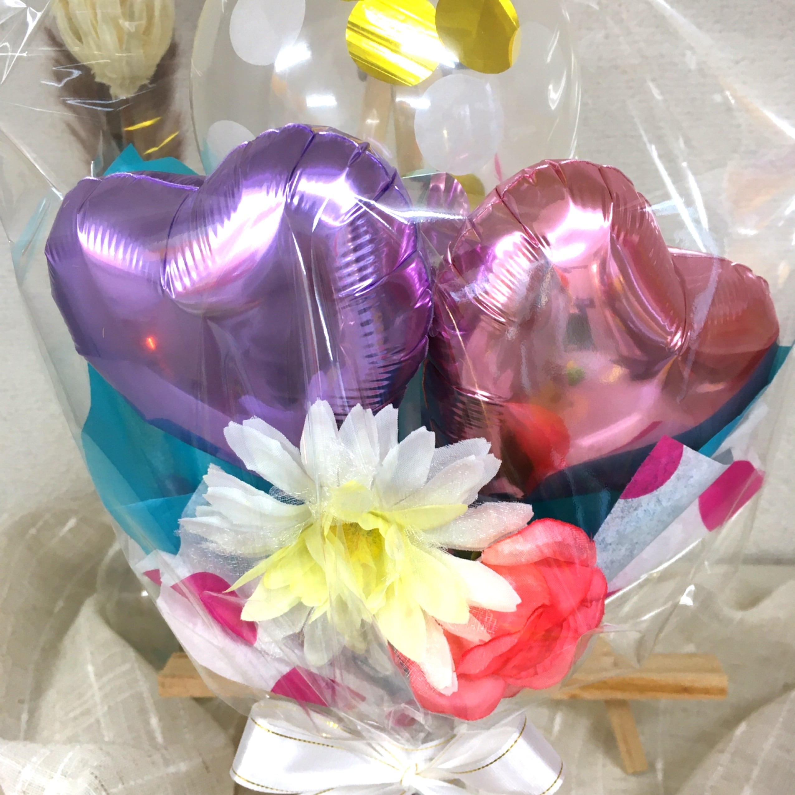 ☆コンフェッティバルーンとパープルとピンクのハートバルーンを使ったミニブーケです。