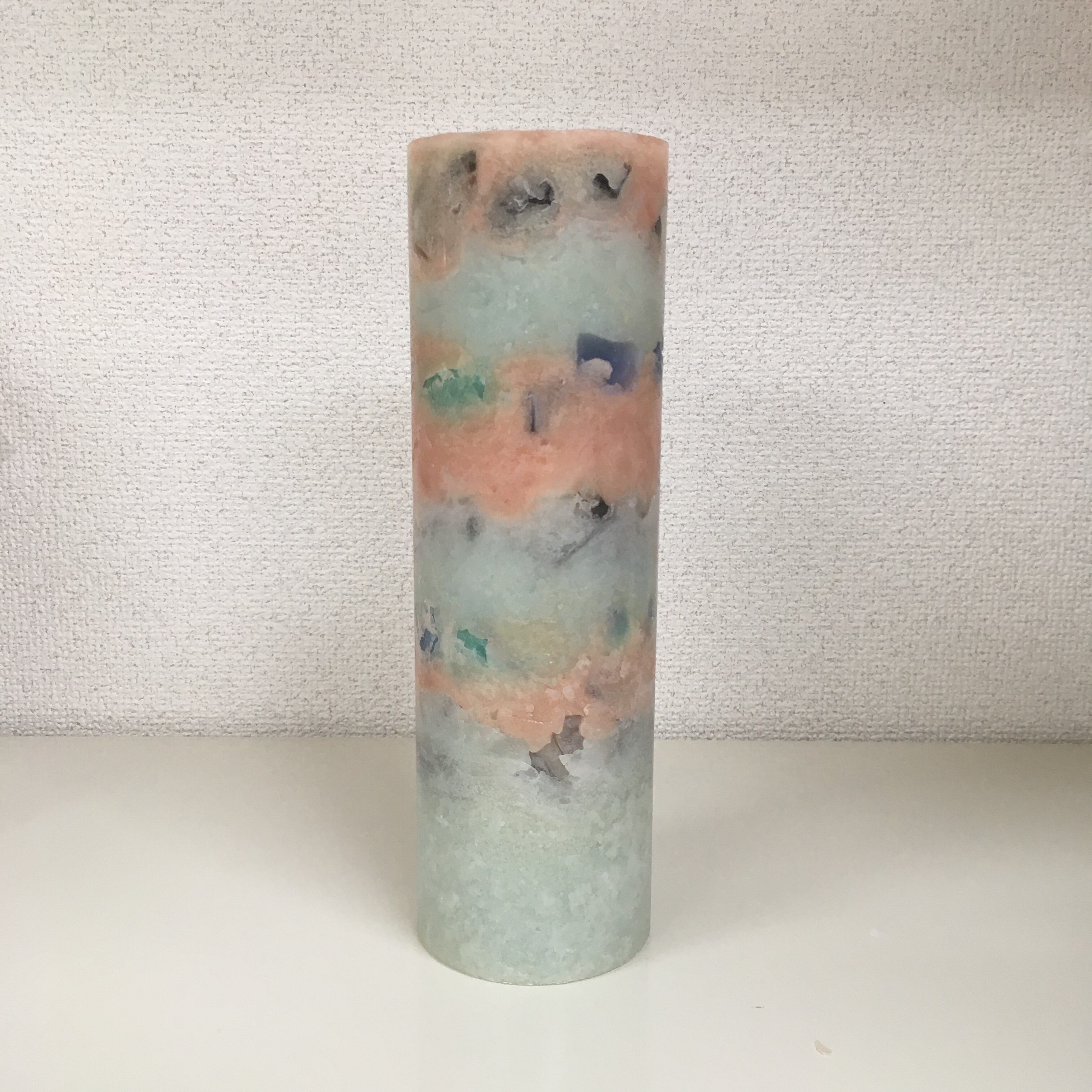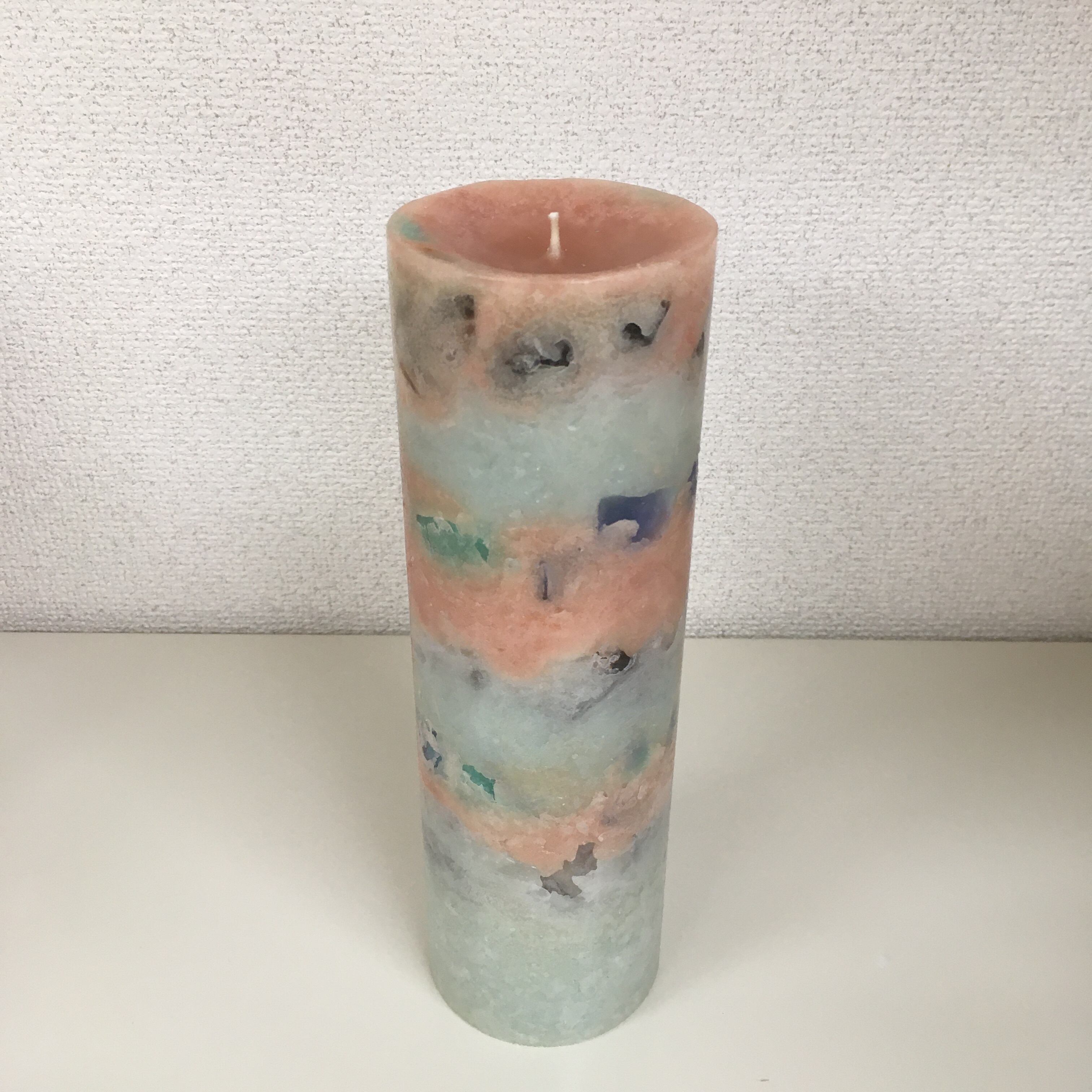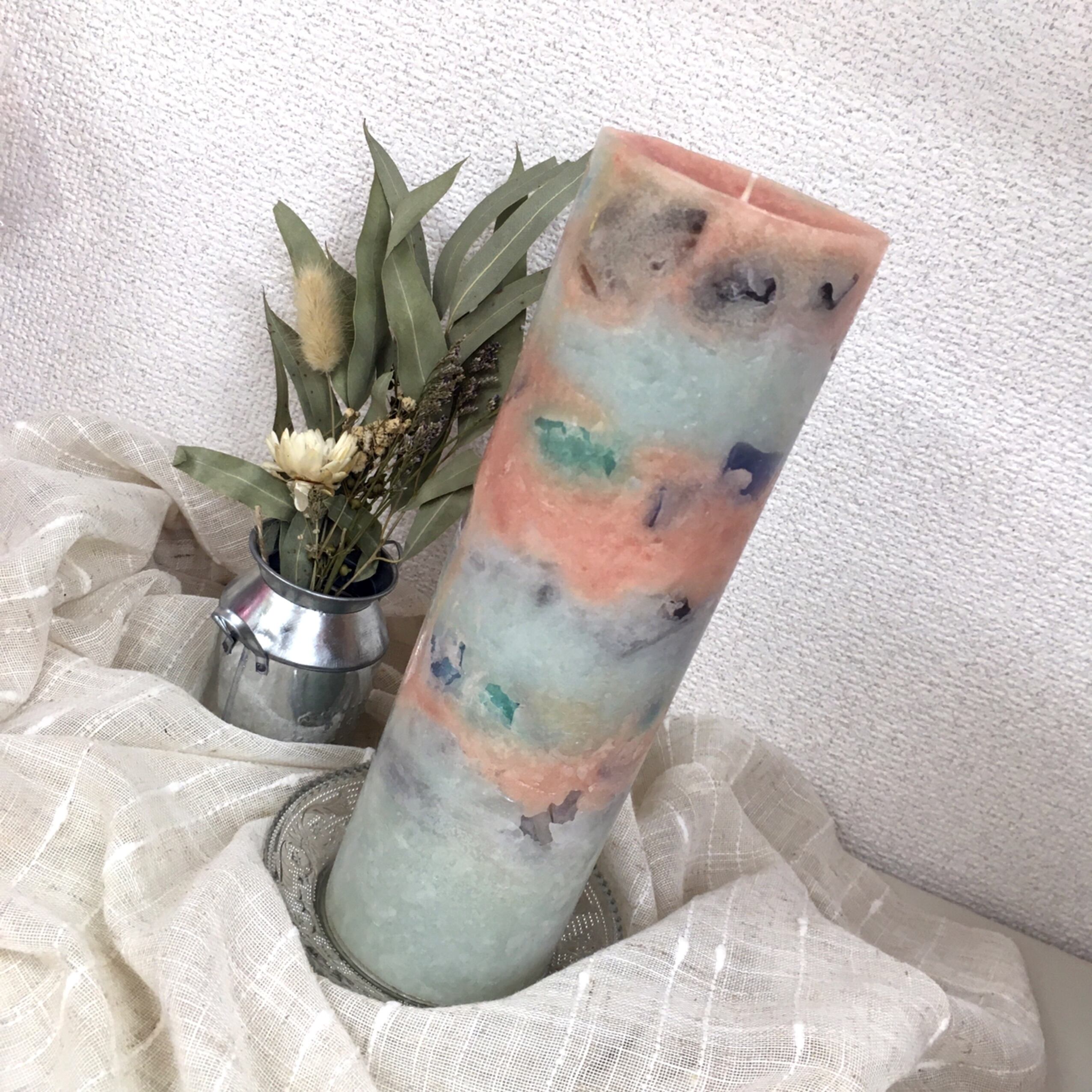 サーモンピンクとくすみグリーンのホイップキャンドルの中にグリーンやグレーなどのチャンクが入っていて、カッコイイキャンドルです。