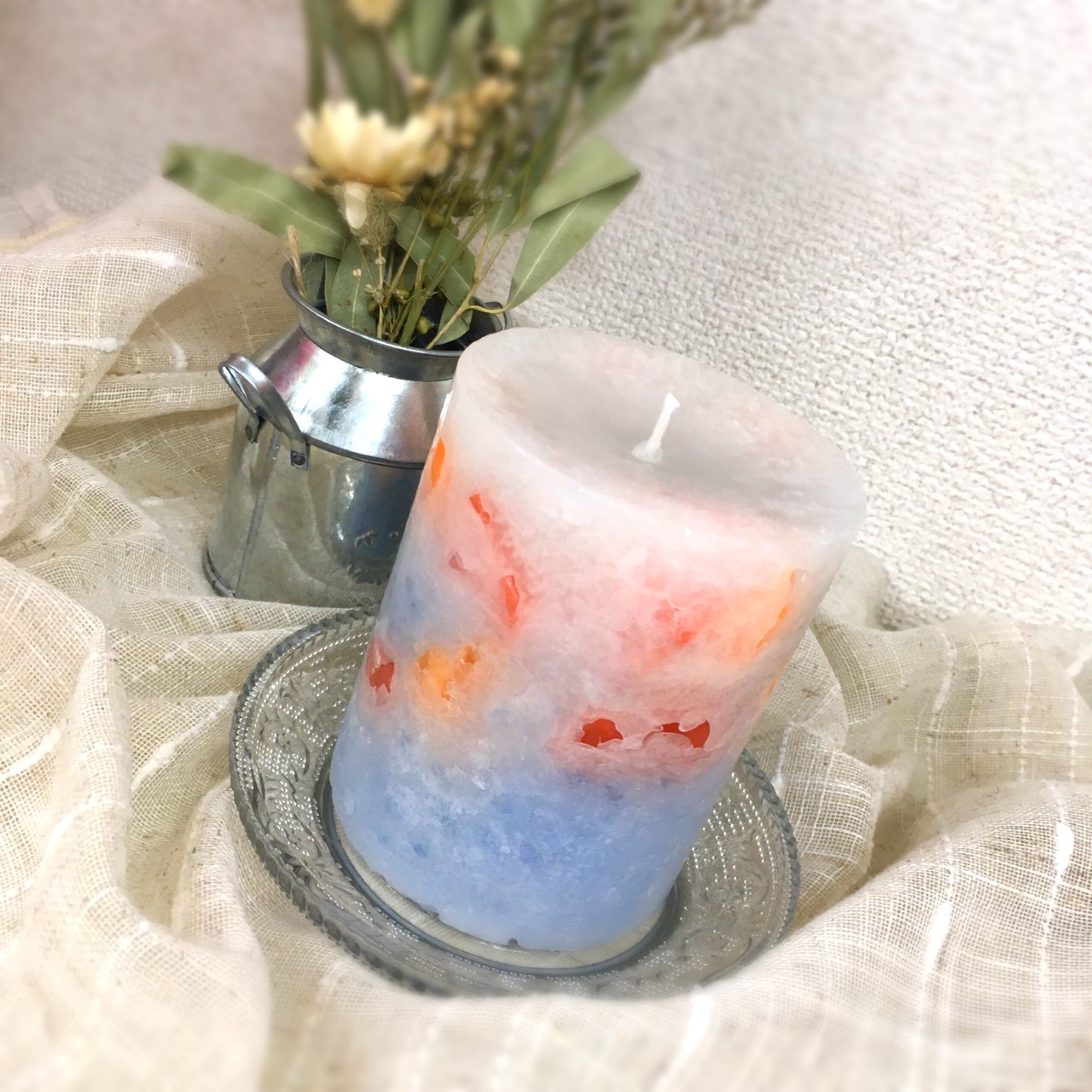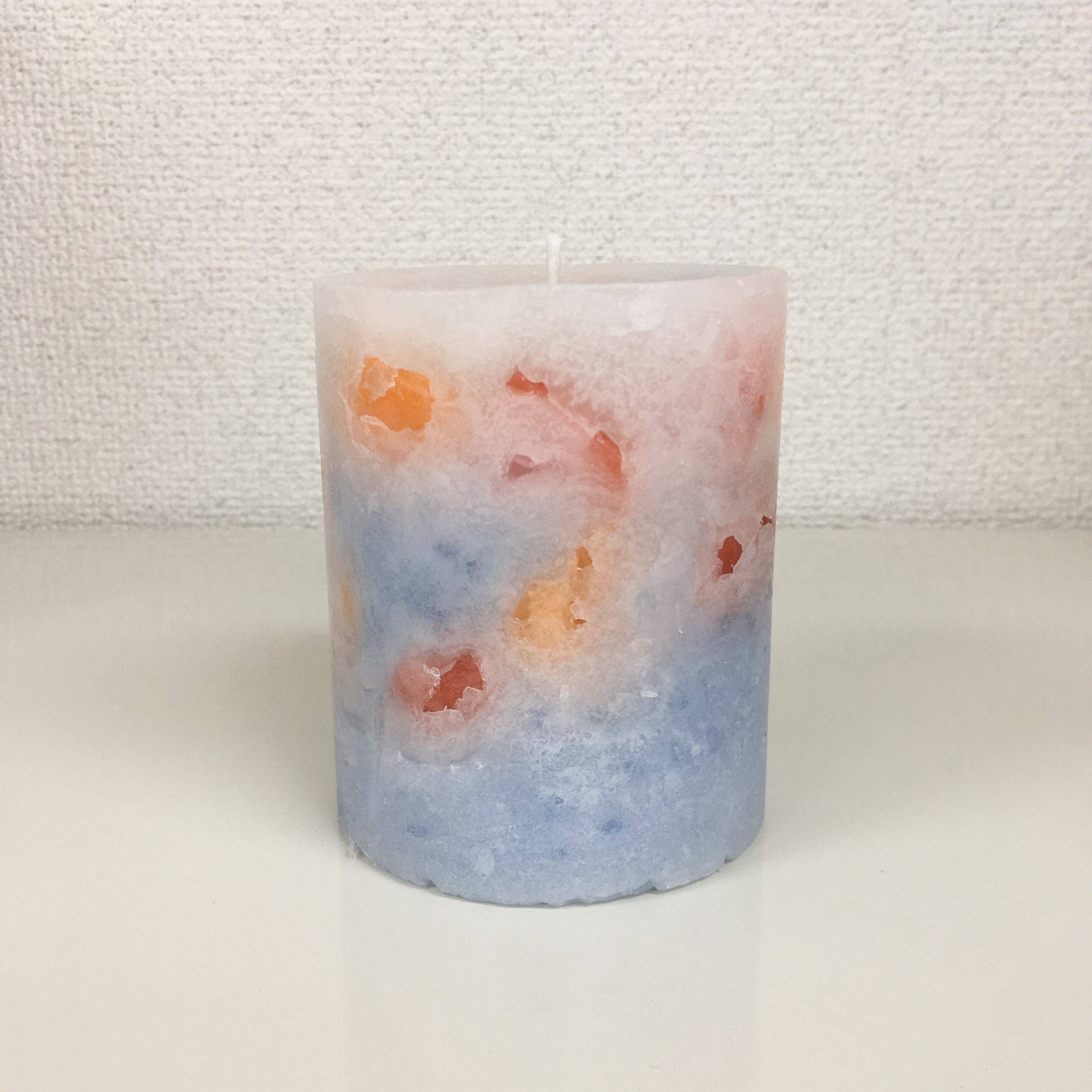 パープルブルー、薄いグレーをホイップにして中に少し薄いグレー、オレンジやレッドのチャンクを入れてあるキャンドルとなっております。