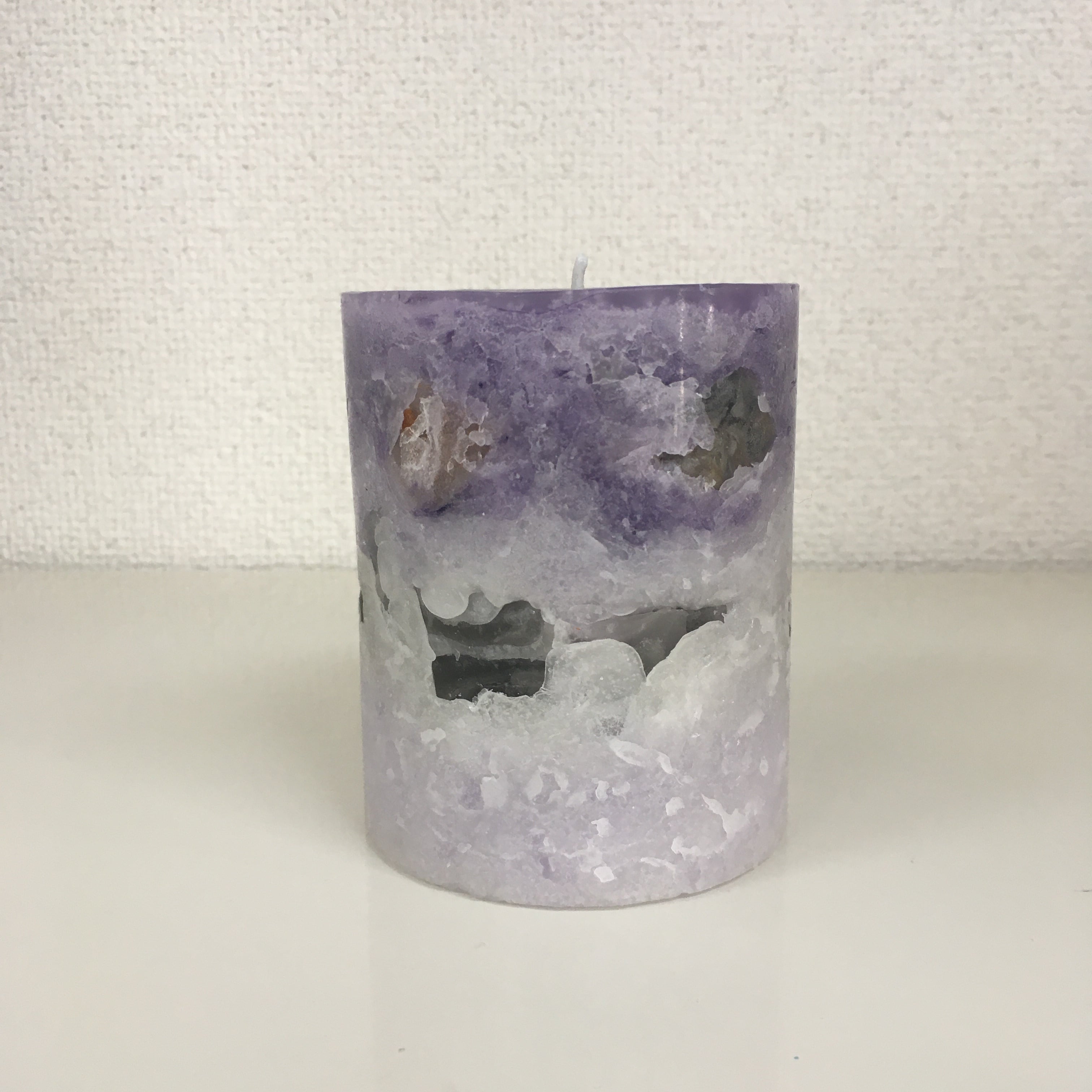 濃いパープル、薄いパープルをホイップにして中に少し薄いグレーと薄いゴールドのチャンクを入れてあるキャンドルとなっております。