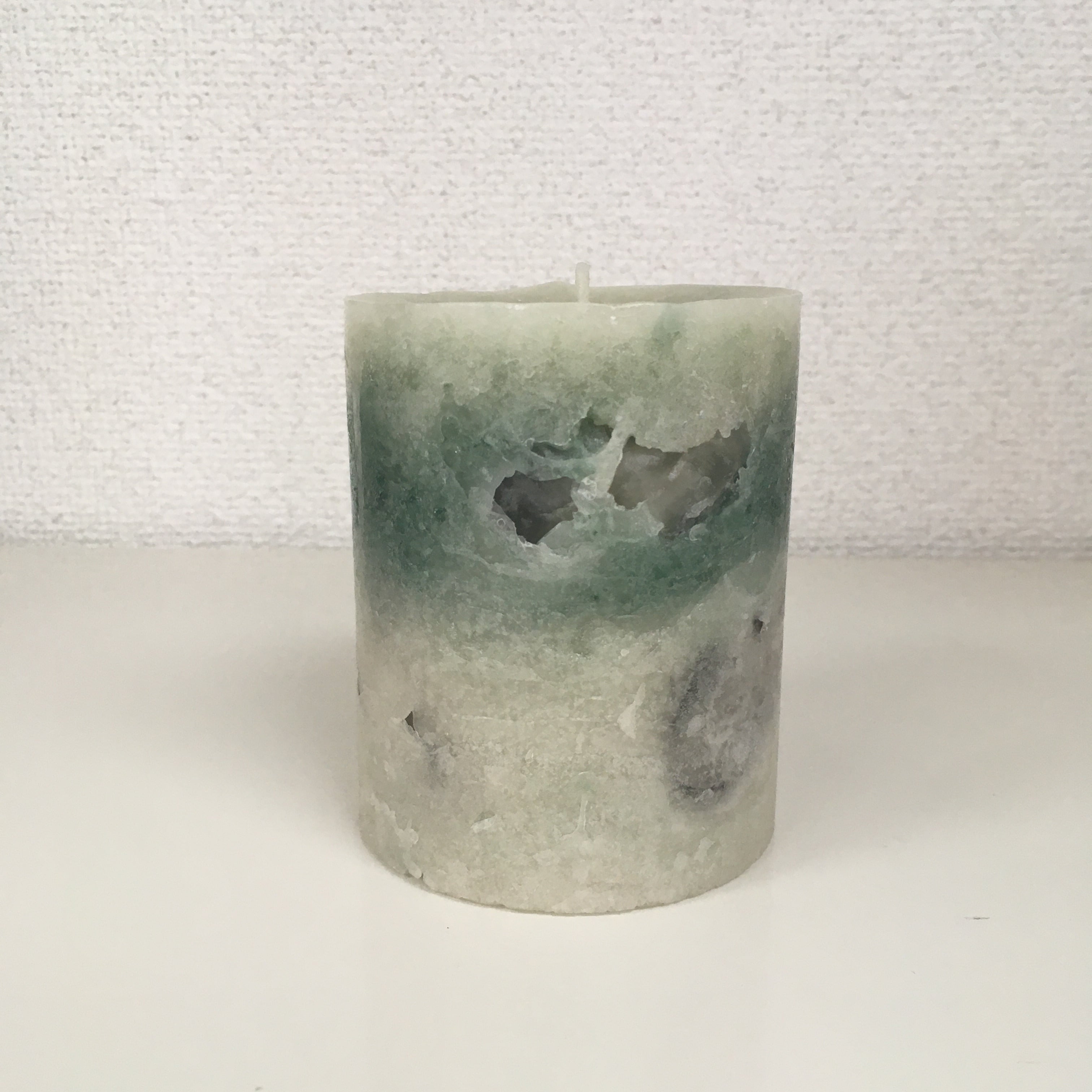 カーキ、薄いグリーンをホイップにして中に少し薄いグレーと薄いゴールドのチャンクを入れてあるキャンドルとなっております。