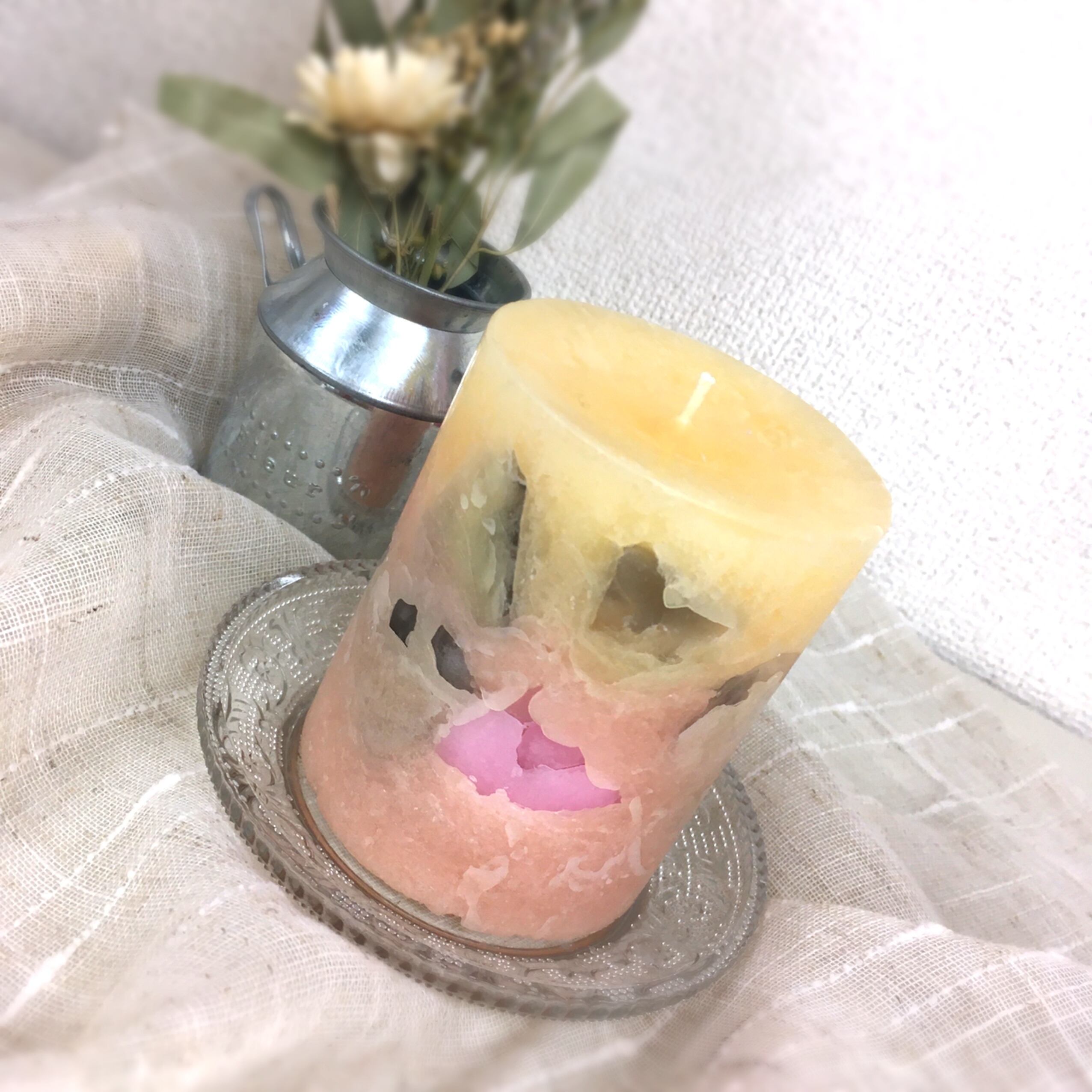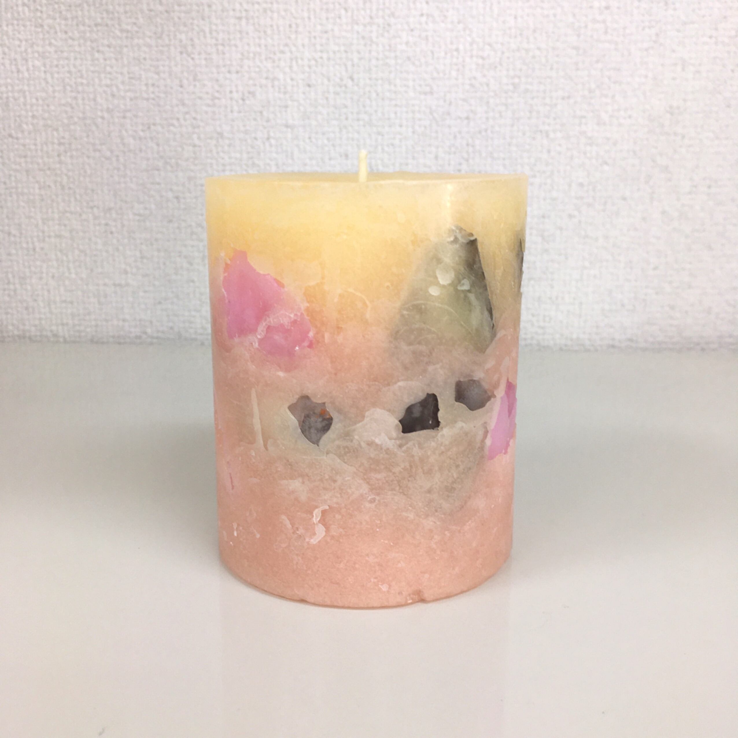 アイボリー、くすみピンクをホイップにして中に黒やピンクのチャンクを入れてあるキャンドルとなっております。