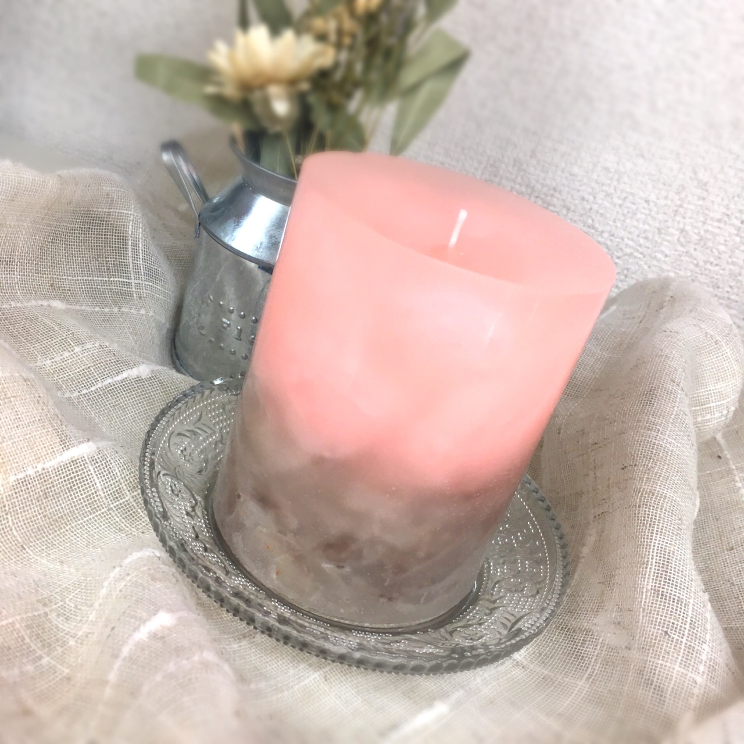 コーラルピンクと茶のチャンクキャンドルなっております。