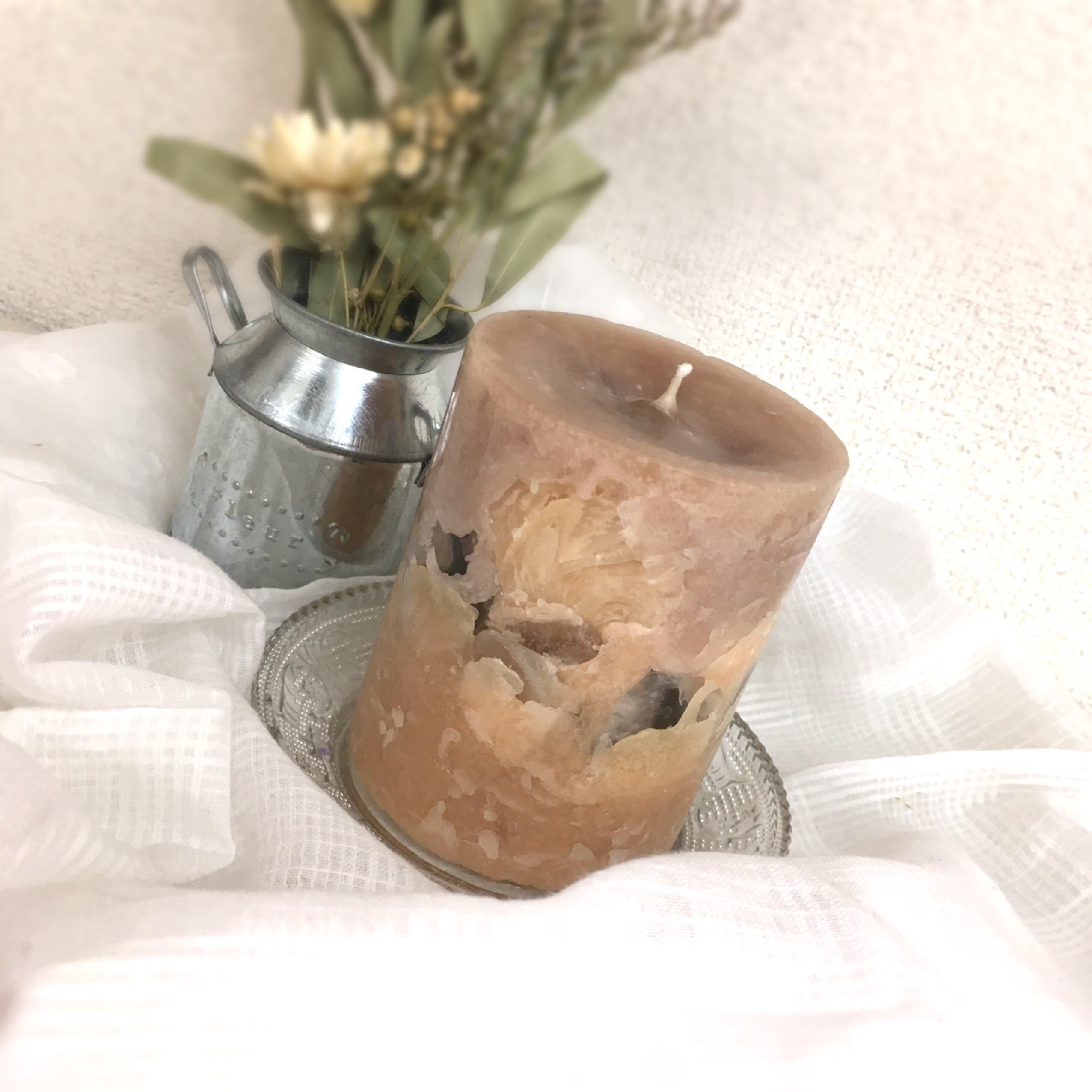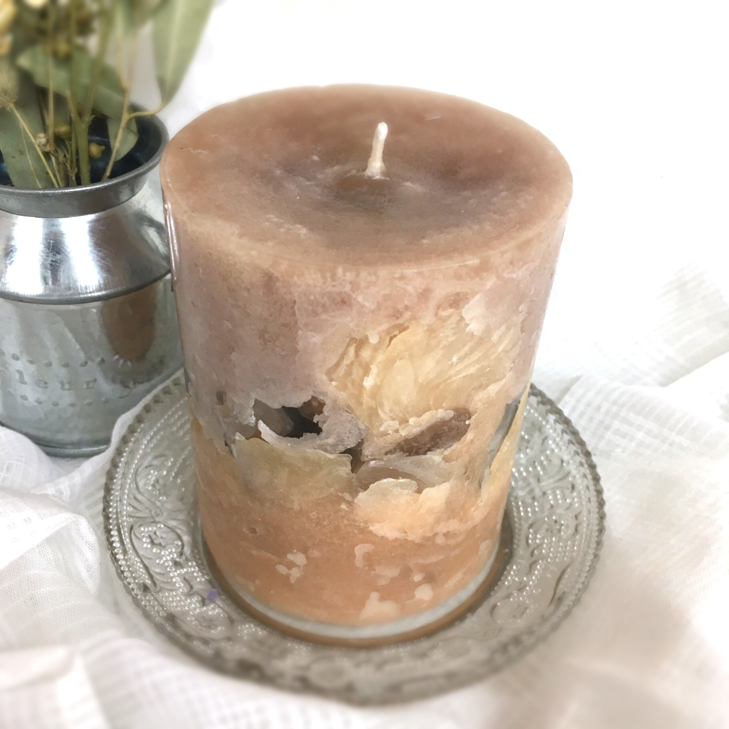 茶とベージュをホイップにして中にゴールドベージュと濃いグレーのチャンクを入れてあるナチュラルカッコイイキャンドルとなっております。