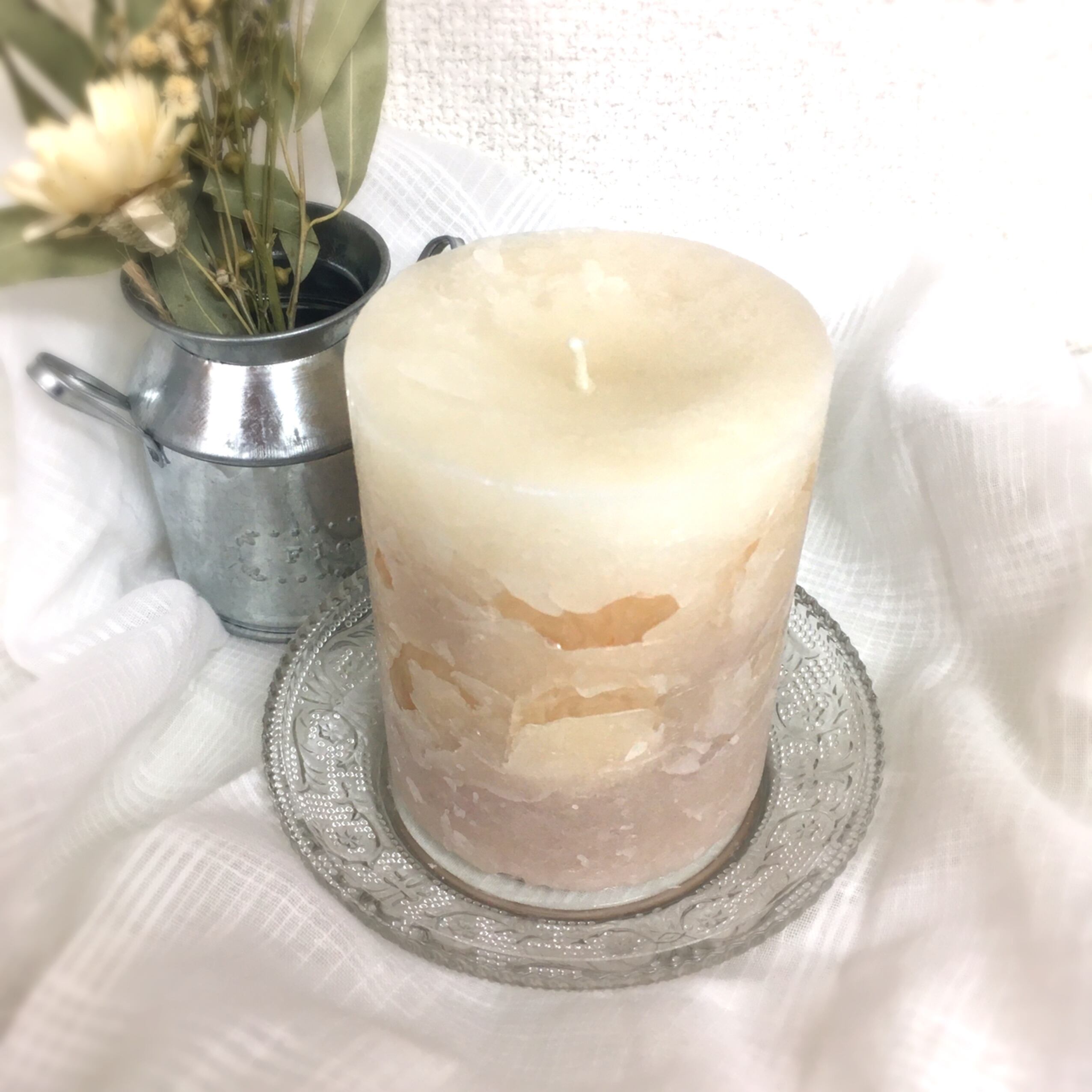 薄い茶とベージュをホイップにして中にゴールドベージュのチャンクを入れてあるナチュラルカッコイイキャンドルとなっております。