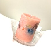 ピンクベージュをホイップにして中にブルー、イエロー、茶、ピンクなどのいろんな色のチャンクを入れてあるポップナチュラルなキャンドルとなっております。